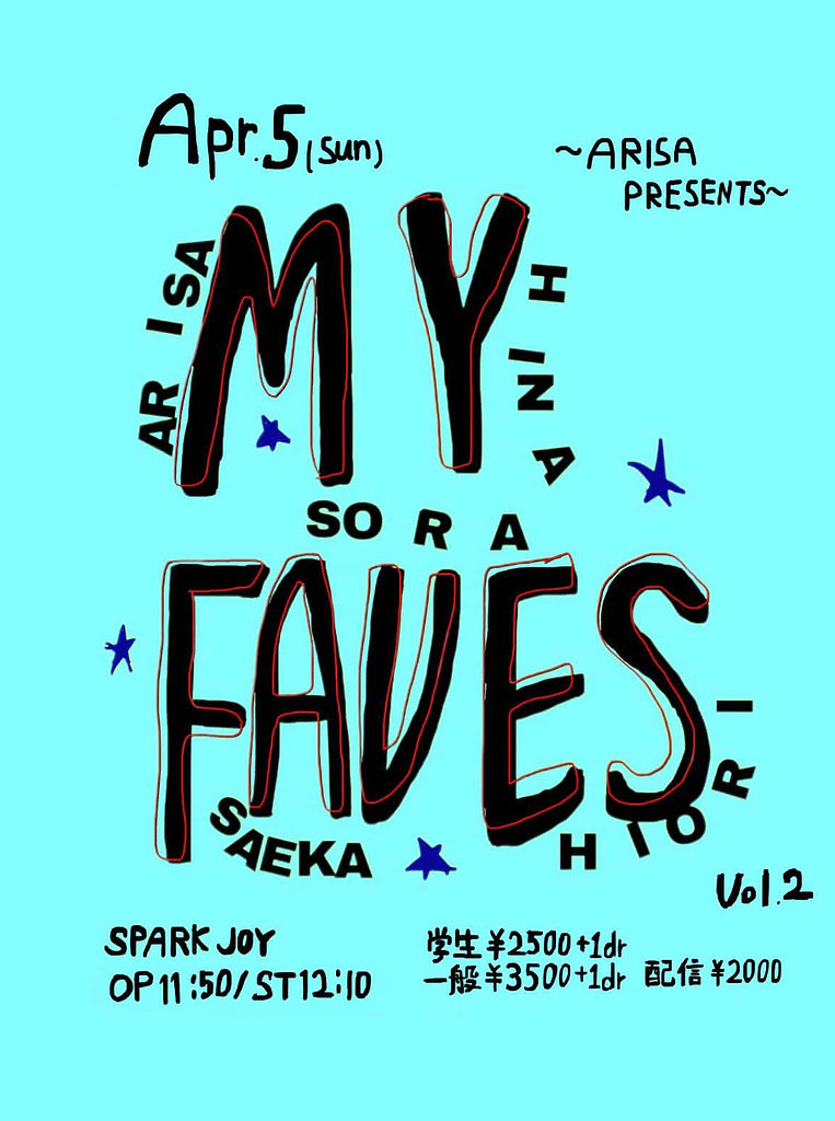 [出演]日菜 / SAEKA / 青空 / ひおり / ARISA[会場]中目黒Spark Joy[時間]OPEN 11:50/ START 12:10 [料金] 一般¥3,500(+1D) 学生 ¥2,500(+1D)配信¥2,000 チケット取り置きはひおりSNS DMまで。[住所]〒153-0051 東京都目黒区上目黒1丁目5−10 中目黒マンションB12